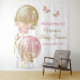 Telones de fondo para baby shower con globos rosas y dorados con flores, lazos y moños sobre un fondo de mariposas rosas y doradas. Este telón de fondo de globos rosas y dorados para baby shower de niña se personaliza fácilmente para tu evento con solo agregar el texto que desees en el estilo de letra que prefieras.