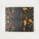Una ilustración original de flores románticas de verano, hibiscos brillantes amarillos y naranjas, flores de crisantemo con pompón rojo con enredaderas verdes giratorias y siluetas de aves golondrinas caprichosas sobre un fondo de pizarra negra. Un diseño hermoso y elegante de temática floral tropical y de jardín para una boda.