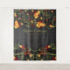 Una ilustración original de flores románticas de verano, hibiscos brillantes amarillos y naranjas, flores de crisantemo rojas con vides verdes giratorias y siluetas de aves golondrinas caprichosas sobre un fondo de pizarra negra. Un diseño hermoso y elegante de temática floral tropical y de jardín para boda.