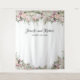 Agrega un divertido fondo para fotos en la recepción de tu boda, fiesta de compromiso, despedida de soltera u otro evento especial con esta tapicería personalizada. Rosas rosadas irresistibles y flores de jardín mezcladas con hojas y ramas colgantes enmarcan los bordes superior e inferior del diseño. El texto se puede personalizar con sus nombres y fecha de boda o cualquier otro texto que desee. Esta tapicería está disponible en una variedad de tamaños y se muestra aquí en el tamaño extra grande.