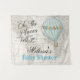 Telón de fondo para baby shower con un globo aerostático azul sobre un fondo de mapa. Este telón de fondo para baby shower se personaliza fácilmente para tu evento añadiendo texto.