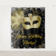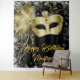 Telón de fondo para fiesta de cumpleaños de máscara con hermosa máscara dorada sobre un fondo bokeh negro, dorado y blanco. Este hermoso telón de fondo de fiesta de máscara negro y dorado se personaliza fácilmente con el texto de su elección. Puede cambiar el color del fondo y del texto.