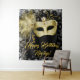 Telón de fondo para fiesta de cumpleaños de máscara con hermosa máscara dorada sobre un fondo bokeh negro, dorado y blanco. Este hermoso telón de fondo de máscara negra y dorada se personaliza fácilmente con el texto que elijas. Puedes cambiar el color del fondo y del texto.