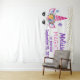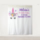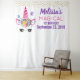 Un tapiz de fondo de foto personalizado con los detalles de su evento. Diseñado con un unicornio rosa de moda. Con una corona floral elegante. Mariposas pequeñas y lindas revoloteando alrededor. Confeti dorado falso espolvoreado a lo largo de la parte superior.