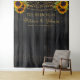 Ramos de girasoles amarillos dorados con tu tipografía dorada falsa personalizada que hace un telón de fondo de madera de granero rústico para cabina de fotos con luces de cuerda para boda. ++++++++++ Fácil de personalizar y perfecto para bodas rústicas de verano u otoño en el jardín trasero de una granja.
