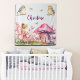 ¡Presentamos nuestro Telón de hongos de hadas rosados con nombre personalizado! Con una hermosa hada observando libélulas mientras cantan pájaros pequeños, rodeada de adorables tulipanes rosados y un hongo de Casa rosa acuarela, este Telón trae encanto y hechizo a cualquier habitación!