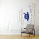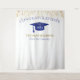 ¡Telón de fondo para celebración de graduación moderna para oportunidades de foto! Brillo en la parte superior e inferior, serpentinas doradas desde el borde superior, gorra de graduación y letras en azul, plantilla de nombre en dorado. 'Clase de' en letras de brillo dorado con plantilla de año en blanco. Agrega año, nombre y nombre de la escuela.