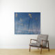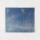 La fotografía original de ZoeSPEAK en este Muro Tapestry capta una bandada de farolillos despegando de la playa, dirigiéndose hacia el océano. Los pájaros blancos, a la luz del sol de tarde, se destacan contra el cielo azul profundo. Los farolillos tienen plumas negras en la cabeza y los bordes de las alas, y colas forjadas como colas de golondrina.
