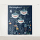 Si estás organizando una fiesta de cumpleaños con tema "bajo el mar", náutico, océano o tiburones, esta preciosa ilustración con tres simpáticos tiburones blancos de dibujos animados nadando sobre un fondo marino lleno de peces, medusas, burbujas, conchas y ondas en el agua es ideal. Hay plantillas en azul claro para el nombre del cumpleañero o cumpleañera y otra para su edad también. El color de fondo azul oscuro se puede cambiar a cualquiera de tu elección.