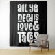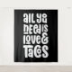 Este diseño presenta la frase "Todo lo que necesitas es amor y tacos" en una letra atrevida y juguetona. El texto tiene un estilo divertido e informal que añade un toque de humor y positividad, lo que lo hace perfecto para los amantes del taco y para los que aprecian un mensaje de buen corazón.