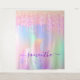 A trendy rainbow colored background with unicorn and rainbow pastel colors in pink, purple, rose gold, mint green. Decorated with faux glitter drips in rose gold, pink and purple. Decorated with a rainbow colored unicorn. Personalize and add a name, written with a modern hand lettered style script with swashes. Purple colored letters. To keep the swashes only delete the sample name, leave the spaces or emoji's in front and after the name.