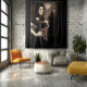 Un vampiro victoriano con una sola lágrima roja de sangre mientras su retrato de hombre lobo se sienta detrás de ella. Amor perdido.