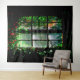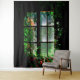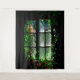 ¿Quieres una ventana extra en tu casa? Un idílico jardín con plantas verdes y flores rojas. Fondo verde oscuro y negro.