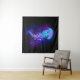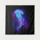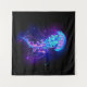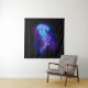 Gran medusa azul, de dibujo artístico, brillante y brillante, con largos tentáculos sobre fondo negro con bioluminiscencia violeta. Luminosas medusas.