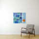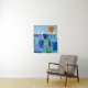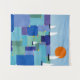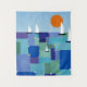 "Radiant Ocean Voyage" es una fascinante imagen artística que muestra una serena escena oceánica con bloques de tonos azules que representan el agua, un sol naranja que ilumina el horizonte y barcos flotando suavemente.