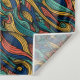 Es vibrante y llamativo, con un patrón paisajista colorido que da la impresión de estar tejido a partir de numerosas hilas de lana. La paleta de colores está compuesta por cuatro colores diferentes y vivos: amarillo, turquesa, azul oscuro y naranja. El uso del amarillo añade un elemento soleado y alegre al diseño, evocando sentimientos de calidez y felicidad. El turquesa, con sus propiedades frescas y tranquilizantes, contrasta maravillosamente con el amarillo, creando un efecto visual equilibrado y armonioso. El azul oscuro introduce profundidad y riqueza en el patrón, anclándolo y proporcionando una sensación de estabilidad. La adición de naranja es una elección audaz, infundiendo energía y vitalidad en el diseño. Sirve como un llamativo color de acento, llamando la atención sobre elementos específicos dentro del patrón paisley. En general, el diseño es una deliciosa combinación de colores y patrones, con un ambiente animado y lúdico, manteniendo al mismo tiempo una sensación de sofisticación y calidez. Es perfecto para añadir un toque de fantasía y creatividad a varios productos y ambientes, desde textiles y moda hasta decoración interior y obras de arte.