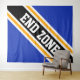 Este diseño deportivo presenta el texto atlético END ZONE dentro de una diagonal ancha realzada de rayas de carreras en blanco, negro y amarillo dorado contra bandas anchas de banda exterior azul real. El texto de este diseño se puede personalizar.