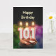 Una torta de torta de cumpleaños con velas. Las velas están compuestas por el número 101, por 101 años. Una tarjeta de cumpleaños para todos.