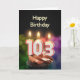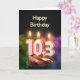 Una torta de torta de cumpleaños con velas. Las velas están compuestas por el número 103, por 103 años. Una tarjeta de cumpleaños para todos.