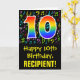 La parte delantera de este divertido, colorido y vibrante diseño de tarjetas de felicitación con temática de cumpleaños presenta un gran número "10" con un patrón inspirado en el gradiente del espectro del arcoiris, junto con el mensaje "Feliz décimo cumpleaños", y un nombre de destinatario personalizado. El frente también presenta un patrón de varias notas musicales y símbolos con una variedad de colores y tamaños. El interior presenta un mensaje de bienvenida de cumpleaños de personalizado, o tal vez podría ser borrado y dejado en blanco si se va a escribir un mensaje a mano. Una tarjeta de cumpleaños de personalizable como esta podría ser una manera divertida de celebrar el décimo cumpleaños de alguien. [~Z0000420]