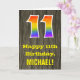 El frente de este diseño de tarjeta de felicitación de cumpleaños colorido pero rústico presenta un gran número "11" con un patrón inspirado en gradiente de espectro de arcoíris. También presenta el mensaje "Feliz cumpleaños número 11", y un nombre de destinatario editable. El fondo de la parte frontal de la tarjeta presenta un patrón de aspecto de grano de madera falsa rústica. El interior presenta un mensaje de felicitación de cumpleaños personalizable, o quizás podría estar en blanco si se desea escribir un mensaje a mano en su lugar. Una tarjeta de cumpleaños personalizable como esta podría ser una forma divertida de reconocer el cumpleaños número once de alguien.