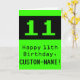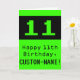 La parte delantera de este diseño de tarjetas de felicitación temática de cumpleaños geek y divertido presenta un gran estilo de videojuegos retro verde "11". También incluye el mensaje de bienvenida de cumpleaños "Feliz cumpleaños número 11", y un nombre personalizado. El interior presenta un mensaje de bienvenida de cumpleaños editable, o tal vez podría ser borrado y dejado en blanco si se va a escribir un mensaje a mano. Una tarjeta de cumpleaños personalizada como esta puede ser una manera divertida de enviar un mensaje para celebrar el undécimo cumpleaños de alguien. [~Z0000430]