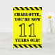 El frente de este llamativo y audaz diseño de tarjetas de felicitación temática de cumpleaños incluye un nombre editable y el mensaje "¡YA TIENES 11 AÑOS!" en un texto de estilo esténcil negro sobre un fondo amarillo. También hay un llamativo patrón de rayas amarillas y negras en los bordes superior e inferior de la parte delantera. El interior presenta un mensaje de bienvenida de cumpleaños personalizado, o tal vez podría ser borrado y dejado en blanco si se va a escribir un mensaje a mano. Una tarjeta de cumpleaños personalizada como esta podría ser una manera divertida de enviar un mensaje para celebrar el undécimo cumpleaños de alguien. [~Z0000413]