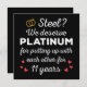 Diseño divertido, perfecto para todo aquel que haya estado casado durante 11 años y para una ceremonia de renovación de la promesa boda. ¡Es un gran conjunto para las parejas! 'Acero? Merecemos Platinum por ponerse al día unos con otros por la cita de 11 años para una pareja que se casó hace 11 años o una pareja que renueva los votos bodas en su aniversario de acero. ¿Eres un marido o una mujer romántica? ¡Acentúa tu estilo con este arte! Gran regalo para tu amigo que se casó hace 11 años, esposo o esposa de 11 años, o papá y mamá celebrando su undécimo aniversario de boda.