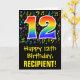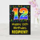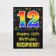 La parte delantera de este divertido, vibrante y colorido diseño de tarjetas de felicitación con temática de cumpleaños presenta un gran número "12" con un patrón inspirado en el gradiente del espectro del arcoiris, junto con el mensaje "Feliz 12 cumpleaños", y un nombre del destinatario del personalizable. El frente también tiene notas musicales coloridas y patrones de símbolos. El interior presenta un mensaje de bienvenida de cumpleaños personalizado, o tal vez podría ser borrado y dejado en blanco si se va a escribir un mensaje a mano. Una tarjeta de cumpleaños personalizada como esta podría ser una manera divertida de enviar un mensaje para celebrar el 12º cumpleaños de alguien. [~Z0000420]