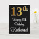 Este elegante, sofisticado y lujoso diseño de tarjetas de felicitación de cumpleaños presenta un gran número ordinal "13th" que tiene un patrón de gradiente inspirado en el oro imitación/faux, junto con el mensaje de bienvenida de cumpleaños "Happy 13th Birthday", y un nombre personalizado en un tipo de letra estilo script en el frente. También tiene un fondo de color negro en la parte delantera. El interior tiene un mensaje personalizado de bienvenida de cumpleaños, o tal vez podría ser borrado y dejado en blanco si se va a escribir un mensaje a mano. Una elegante tarjeta de felicitación de cumpleaños de personalizable como esta podría enviarse para celebrar el decimotercer cumpleaños de alguien. [~Z0000518]