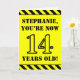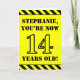 La parte delantera de este divertido y audaz diseño de tarjetas de felicitación con temática de cumpleaños incluye un nombre editable y el mensaje "¡TÚ ERES AHORA DE 14 AÑOS!" en un texto inspirado en esténcil negro con un fondo amarillo de color. También hay un llamativo patrón de rayas negras y amarillas en los bordes superior e inferior de la parte delantera. El interior presenta un mensaje de bienvenida de cumpleaños editable, o tal vez podría ser borrado y dejado en blanco si se va a escribir un mensaje a mano. Una tarjeta de cumpleaños de personalizable como esta podría ser una manera divertida de reconocer el décimo cuarto cumpleaños de alguien. [~Z0000413]