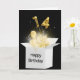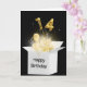 Globos de oro y vigas brillantes de luz brillan en una caja blanca sobre fondo negro para 14 años El texto Feliz Cumpleaños en la caja blanca se puede cambiar.