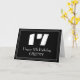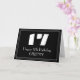 Este estilo retro Roaring '20 inspirado en el diseño de la tarjeta de felicitación con temática de cumpleaños incluye un gran estilo Art Déco inspirado en el número "17", el mensaje "Happy 17th Birthday", un nombre de personalizable, y un patrón fronterizo consistente en líneas delgadas en el frente. El fondo del frente es negro de color. El interior tiene un mensaje personalizado de bienvenida de cumpleaños, o tal vez podría ser borrado y dejado en blanco si se va a escribir un mensaje a mano. Una tarjeta de felicitación de cumpleaños editable como esta puede ser una manera divertida de entregar algunos deseos de cumpleaños a alguien que está celebrando su decimoséptimo cumpleaños. [~Z0000486]