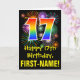 El frente de este colorido, divertido y emocionante diseño de tarjetas de felicitación de cumpleaños incluye un gran número de "17" con un patrón inspirado en el gradiente del espectro arcoiris, junto con el mensaje "Feliz cumpleaños número 17", y un nombre de destinatario personalizado. El frente también presenta un colorido patrón de fondo inspirado en la apariencia de los fuegos artificiales de celebración que estallan. El interior presenta un mensaje de bienvenida de cumpleaños de personalizado, o tal vez podría ser borrado y dejado en blanco si se va a escribir un mensaje a mano. Una tarjeta de cumpleaños de personalizable como esta podría ser una manera divertida de enviar un mensaje para celebrar el decimoséptimo cumpleaños de alguien. [~Z0000442]