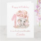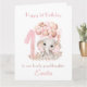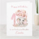 Tarjeta plegada dulce con un adorable chica de elefantes, número uno y globos en tonos beige oscuro y rosa suave para el primer cumpleaños de una niña. Personaliza fácilmente esta tarjeta con tu propio texto. - Kate Eden Art