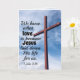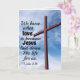 Tarjeta de salutación de las Escrituras representa un cielo azul con una cruz de madera y presenta el versículo bíblico 1 Juan 3:1, "Así es como sabemos qué es el amor: Jesús Cristo dio su vida por nosotros. Y debemos dar nuestra vida por nuestros hermanos y hermanas". Fotografía de Aaron Burden.
