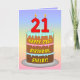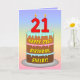 Este alegre y animado diseño de tarjetas de felicitación con temática de cumpleaños incluye una representación al estilo personalizado de una torta de cumpleaños de tres niveles con velas en forma de número en la parte superior que muestran la edad de "21", junto con el mensaje "FELIZ 21º CUMPLEAÑOS", y un nombre de destinatario personalizado. El fondo de la parte delantera presenta un degradado inspirado en el espectro de arcoiris pastel multicolor. El interior tiene un mensaje de saludo de cumpleaños modificable, o tal vez podría ser borrado y dejado en blanco si se va a escribir un mensaje a mano. Una tarjeta de felicitación de cumpleaños colorida y editable como esta podría ser una manera divertida de enviar saludos de cumpleaños a alguien que está celebrando su vigésimo primer cumpleaños. [~Z0000625]