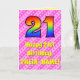 La parte delantera de este alegre y divertido diseño de tarjetas de felicitación con temática de cumpleaños 21 presenta un gran número "21" con un patrón colorido inspirado en el aspecto de un espectro arcoiris. También incluye el mensaje "Feliz cumpleaños 21", seguido de un nombre de destinatario personalizado. El fondo de la parte delantera está decorado con rayas rosas oscuras y rosas claras que contienen formas cariñosas de corazón rosado. El interior presenta un mensaje de bienvenida de cumpleaños editable, o tal vez podría ser borrado y dejado en blanco si se va a escribir un mensaje a mano. Una tarjeta de cumpleaños de personalizable como esta podría ser una manera divertida de reconocer el 21 cumpleaños de alguien. [~Z0000416]