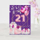 Celebre su 21º cumpleaños con este diseño moderno y funky con luces de cuerda colgantes verticales debajo, que es un marco falso hexágono de oro alrededor de los números veintiuno. Debajo de esto hay purpurinas falsos de plata rociando detrás de hermosos regalos brillantes que han sido envueltos en papel vibrante rosado bonito. En los regalos aparecen cintas y etiquetas delgadas. El mensaje interno puede cambiarse para adaptarlo a sus necesidades personales. Ideal para las mujeres.
