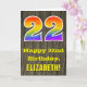 La parte delantera de este colorido pero rústico diseño de tarjetas de felicitación de cumpleaños presenta un gran número "22" con un patrón inspirado en el gradiente del espectro arcoiris, junto con el mensaje "Feliz cumpleaños número 22", y un nombre de destinatario personalizado. En la parte delantera hay un fondo que representa un estilo rústico de imitación de grano de madera. El interior presenta un mensaje de bienvenida de cumpleaños personalizado, o tal vez podría ser borrado y dejado en blanco si se va a escribir un mensaje a mano. Una tarjeta de cumpleaños personalizado como esta podría ser una manera divertida de enviar deseos de cumpleaños a alguien que esté celebrando su vigésimo segundo cumpleaños. [~Z0000419]