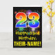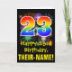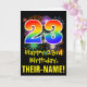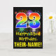 La parte delantera de este colorido, emocionante y divertido diseño de tarjetas de felicitación con temática de cumpleaños presenta un gran número "23" con un patrón inspirado en el gradiente del espectro arcoiris, junto con el mensaje "Feliz cumpleaños número 23", y un nombre de destinatario del personalizable. El frente tiene además un colorido estallido de fuegos artificiales de celebración inspirados en el patrón de fondo. El interior presenta un mensaje de bienvenida de cumpleaños modificable, o tal vez podría ser borrado y dejado en blanco si se va a escribir un mensaje a mano. Una tarjeta de cumpleaños de personalizable como esta podría ser una manera divertida de enviar un mensaje celebrando el vigésimo tercer cumpleaños de alguien. [~Z0000442]