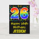 La parte delantera de este divertido, vibrante y colorido diseño de tarjetas de felicitación con temática de cumpleaños presenta un gran número "26" con un patrón inspirado en el gradiente del espectro arcoiris. También incluye el mensaje "Feliz cumpleaños 26", y un nombre de destinatario editable. El frente también tiene notas musicales coloridas y patrones de símbolos. El interior presenta un mensaje de bienvenida de cumpleaños personalizado, o tal vez podría ser borrado y dejado en blanco si se va a escribir un mensaje a mano. Una tarjeta de cumpleaños personalizada como esta podría ser una manera divertida de celebrar el 26 cumpleaños de alguien. [~Z0000420]