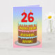 Este alegre y optimista diseño de tarjetas de felicitación de cumpleaños incluye una representación al estilo personalizado de una torta de cumpleaños de tres niveles con velas en forma de numeral en la parte superior que muestran el número "26", junto con el mensaje "FELIZ CUMPLEAÑOS 26", y un nombre de destinatario personalizado. El fondo de la parte delantera tiene un diseño multicolor de gradiente inspirado en el espectro arcoiris pastel. El interior tiene un mensaje personalizado de bienvenida de cumpleaños, o tal vez podría ser borrado y dejado en blanco si se va a escribir un mensaje a mano. Una tarjeta de felicitación divertida y de personalizable como esta podría ser una manera divertida de enviar un mensaje de felicitación de cumpleaños a alguien que está celebrando su 26 cumpleaños. [~Z0000625]