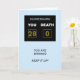 Tarjeta de cumpleaños 28 Una tarjeta de cumpleaños divertida para dar por un cumpleaños. Un marcador muestra la edad como la puntuación ganadora contra la Muerte. Las palabras "¡Estás ganando, mantenlo!" completan la escena.