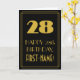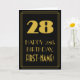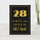 Este diseño inspirado en la época de los locos años 2000 y con un aspecto vintage/retro de tarjetas de felicitación con temática de cumpleaños cuenta con un gran estilo Art Deco inspirado en el número "28", el mensaje "FELIZ 28º CUMPLEAÑOS", un nombre editable, y un patrón de borde formado por líneas delgadas en el frente. El frente tiene un fondo de color negro. El interior tiene un mensaje de saludo de cumpleaños modificable, o tal vez podría ser borrado y dejado en blanco si se va a escribir un mensaje a mano. Una tarjeta de felicitación personalizada de cumpleaños como esta podría ser una manera divertida de enviar saludos de cumpleaños a alguien que está celebrando su 28 cumpleaños. [~Z0000499]