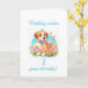 2.ª tarjeta de cumpleaños para un niño que ama a su cachorro. Un lindo cachorro sonriendo para decir feliz segundo cumpleaños. Un cachorro marrón con flores y mariposas que envía deseos de cumpleaños.