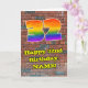 Este vibrante y divertido graffiti urbano y diseño de tarjetas de felicitación de cumpleaños con temática de arte callejero presenta un gran número "32" con un patrón multicolor inspirado en el gradiente del espectro arcoiris. También incluye el mensaje "Feliz cumpleaños número 32", y un nombre editable. El fondo del frente tiene un patrón de pared de ladrillo. El interior presenta un mensaje de bienvenida de cumpleaños de personalizado, o tal vez podría ser borrado y dejado en blanco si se va a escribir un mensaje a mano. Una tarjeta de felicitación de cumpleaños vibrante y editable como esta podría ser una manera divertida de enviar un mensaje de felicitación de cumpleaños a alguien que está celebrando su cumpleaños número treinta y dos. [~Z0000586]
