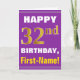 Las características del este de felicitación diseño cumpleaños-temáticas simples de la tarjeta un deseo caliente del cumpleaños tienen gusto del "32do CUMPLEAÑOS FELIZ, Primero-Nombre!" en el frente, en texto intrépido en una púrpura coloreó el fondo. El número del cumpleaños tiene un falso/una imitación oro-como aspecto del colorante. El nombre en el frente puede ser modificado para requisitos particulares. Las características interiores un mensaje del cumpleaños que puede ser modificado para requisitos particulares. Una tarjeta de felicitación como esto podría ser una manera de la diversión de entregar deseos del cumpleaños alguien que está celebrando su segundo cumpleaños treinta. [~Z0000277]
