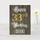 La parte delantera de este adorable y elegante diseño de tarjetas de felicitación de cumpleaños incluye el mensaje "Feliz cumpleaños 33", y un nombre editable del destinatario. Parte del mensaje está en un texto elegante estilo script. El gran número 33 presenta un estilo de imitación/imitación de inspiración dorada. El fondo tiene un patrón imitación/falso inspirado en el grano de madera. El interior tiene un mensaje de saludo de cumpleaños modificable, o tal vez podría ser borrado y dejado en blanco si se va a escribir un mensaje a mano. Una tarjeta de felicitación formal de cumpleaños de personalizable como esta podría ser enviada para celebrar el 33 cumpleaños de alguien. [~Z0000561]