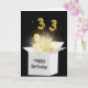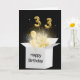 Globos de oro y vigas brillantes de luz brillan en una caja blanca sobre fondo negro para 33 años El texto Feliz Cumpleaños en la caja blanca se puede cambiar.